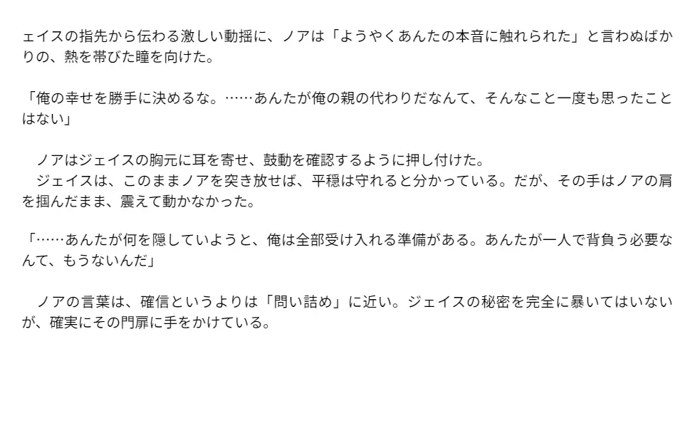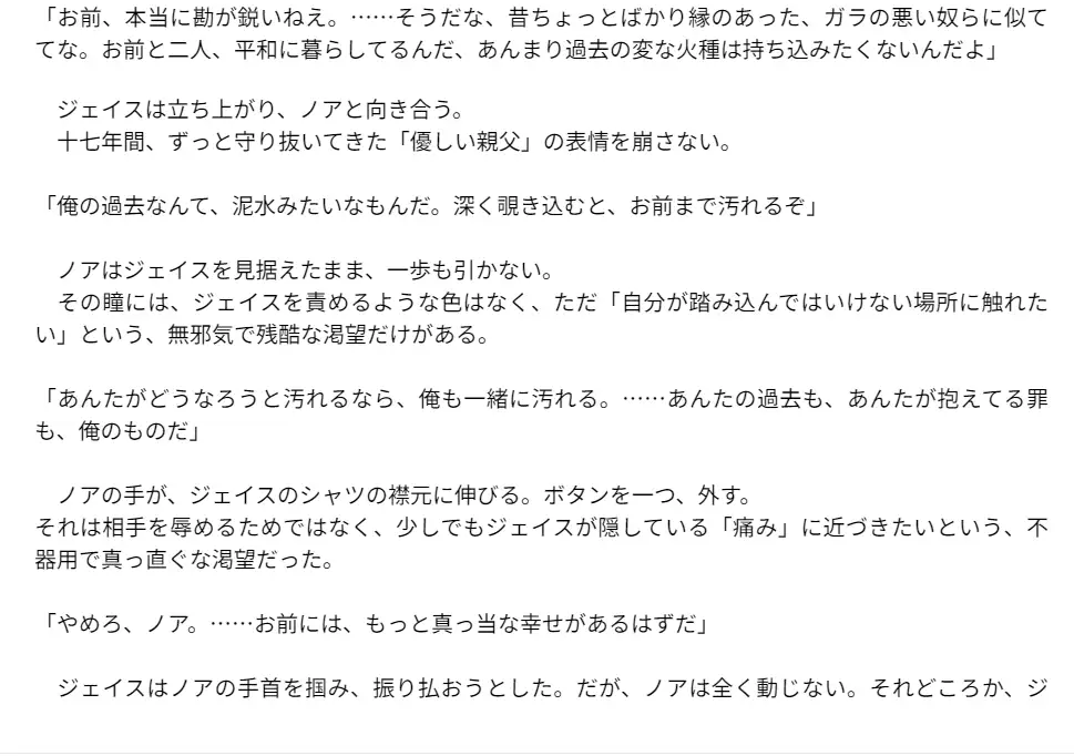 けれどそれは、互いの「執着」と「秘密」によって、静かに壊れかけていました。便利屋の男・ジェイスと、彼を逃がさない養い子・ノア。