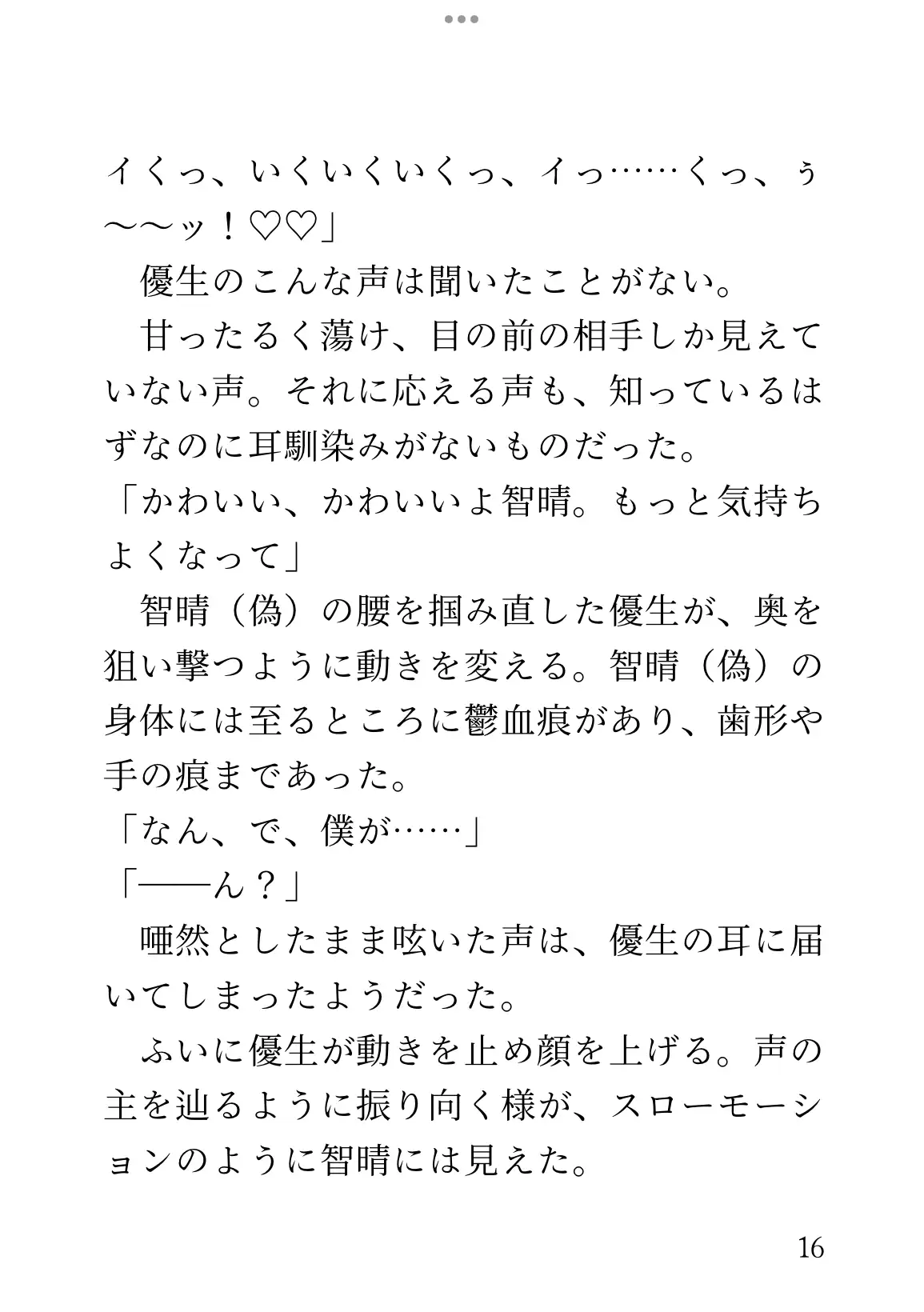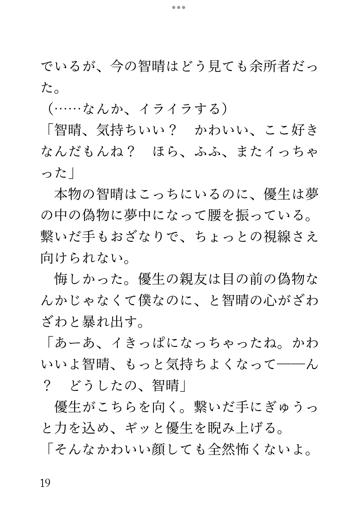 少しの気まずさを抱えながらも向かった智晴は、そこで犯されているのが自分なことに気づく。甘い声を上げながら優生に揺さぶられている、夢の中の幻の自分。たっぷりと腹の中に精液を出されるその偽物に、智晴は気づけば嫉妬を覚えていた。