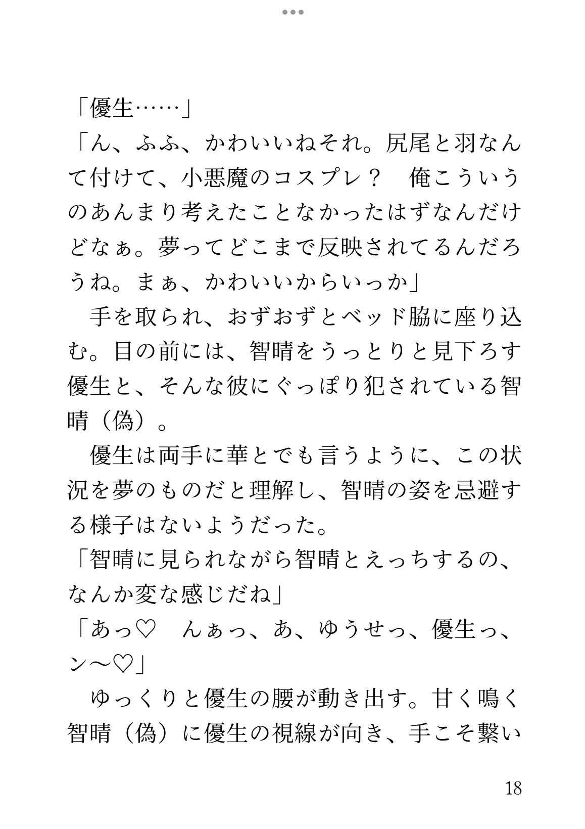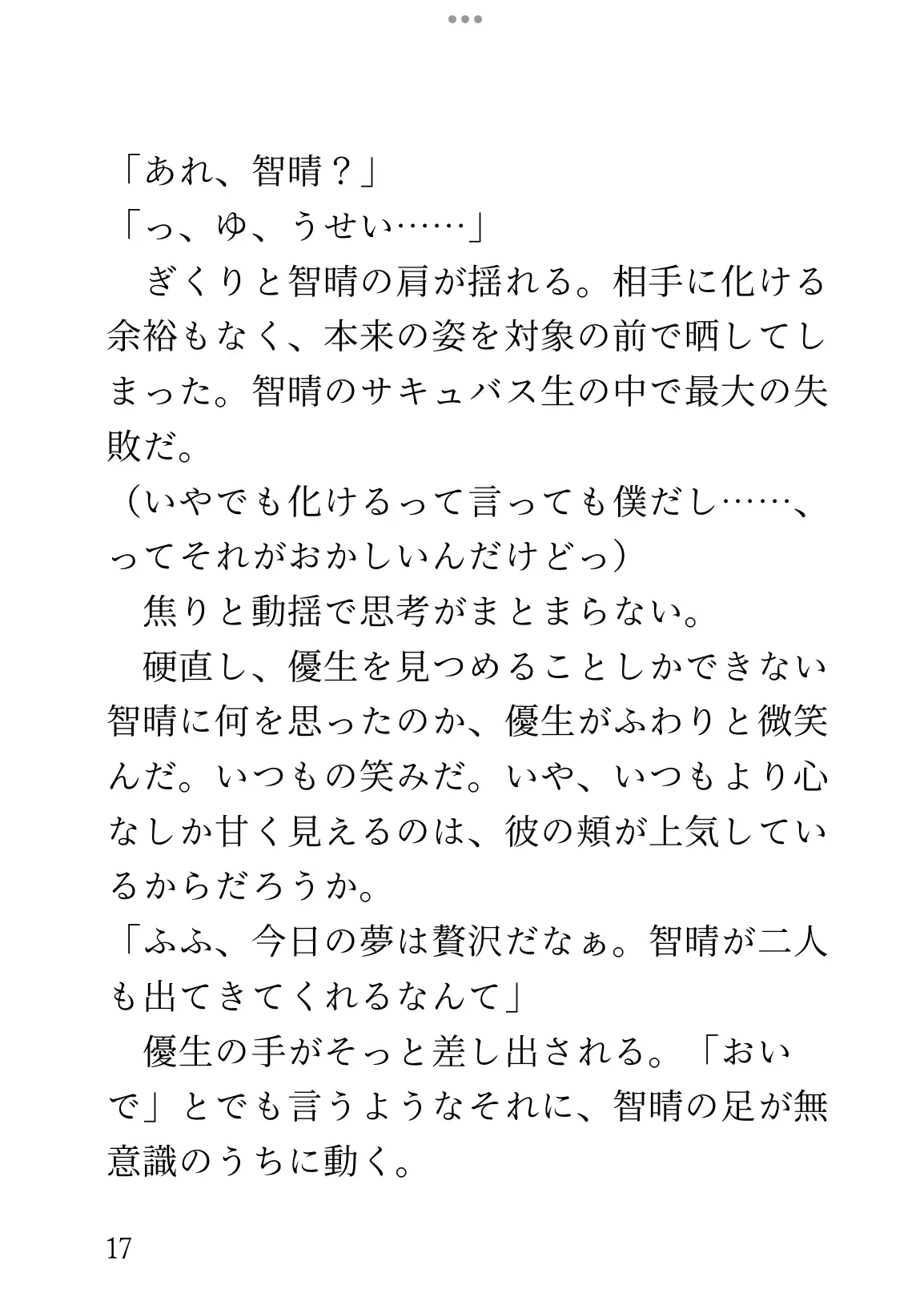 実は智晴のことが好きで、毎夜の如く夢の中で愛し尽くしていた。夢にもう一人の智晴が出てきても、「まぁ自分に都合がいいのが夢だしな」とたっぷり愛した。智晴がサキュバスなことは知らない。【含まれる要素】