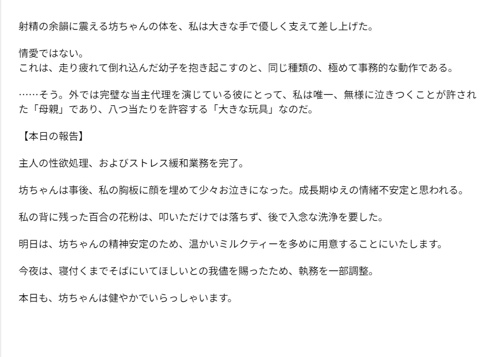 特殊な形式: 毎話、執事による「事後報告書」で締めくくられる日記形式の読み物。【性癖・要素】