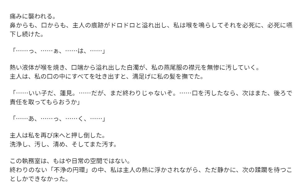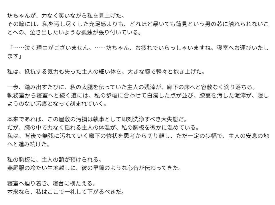 どれほど無様に汚されても、蓮見は淡々と「業務」として受け入れ続け、翌朝には完璧な執事として跪く。「俺のものだと認めろ」と牙を剥く坊ちゃんと、「坊ちゃんは健やかでいらっしゃいます」と心を渡さない蓮見。