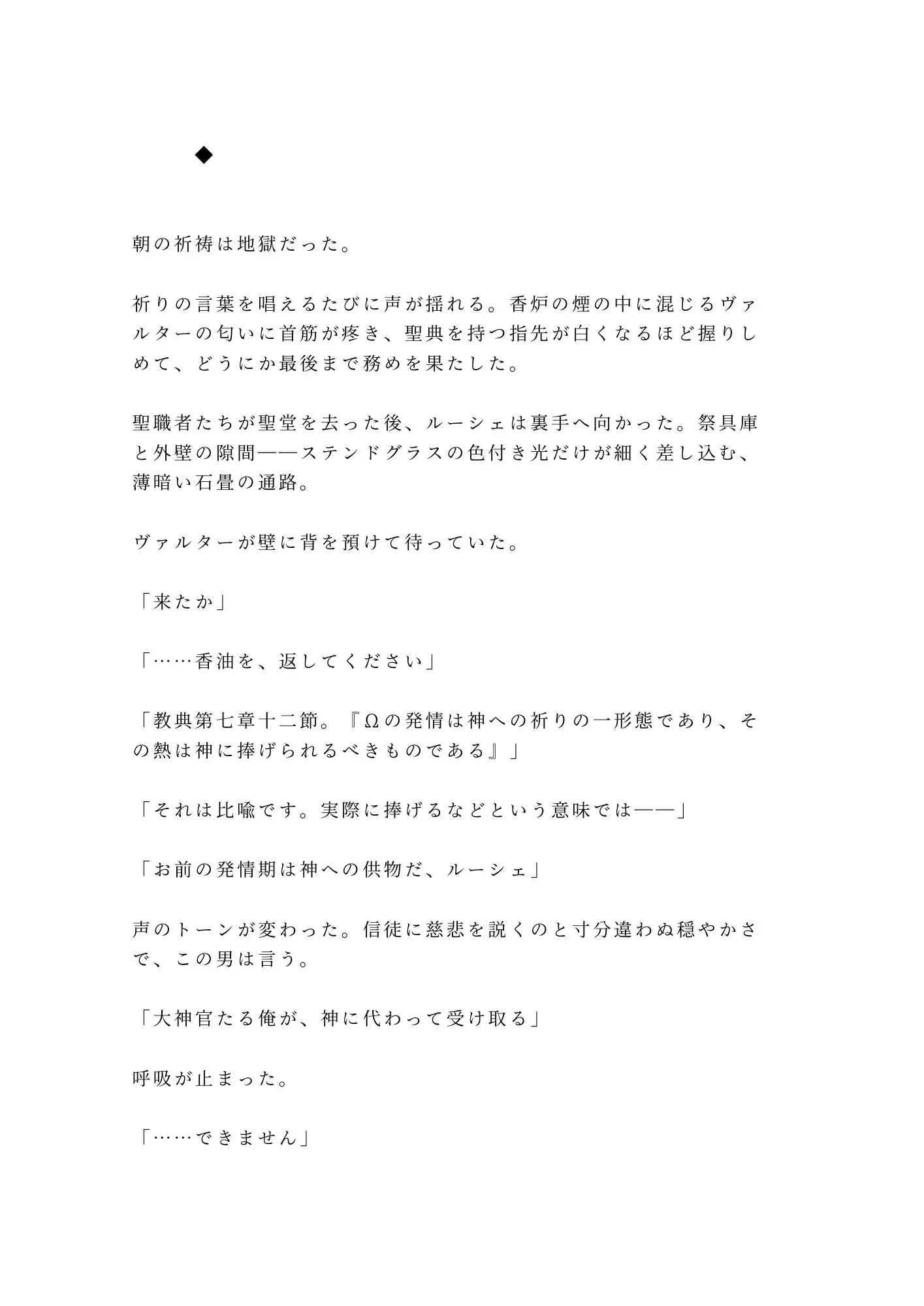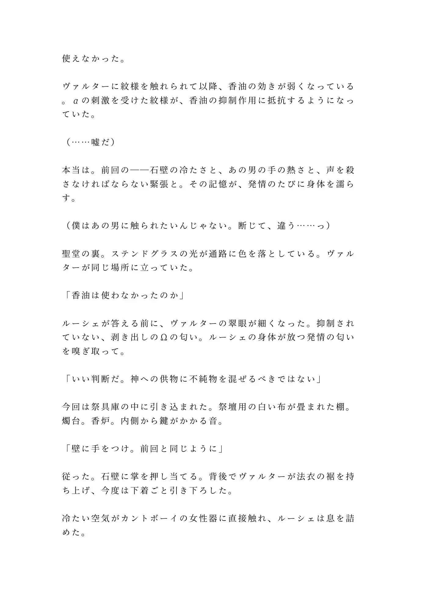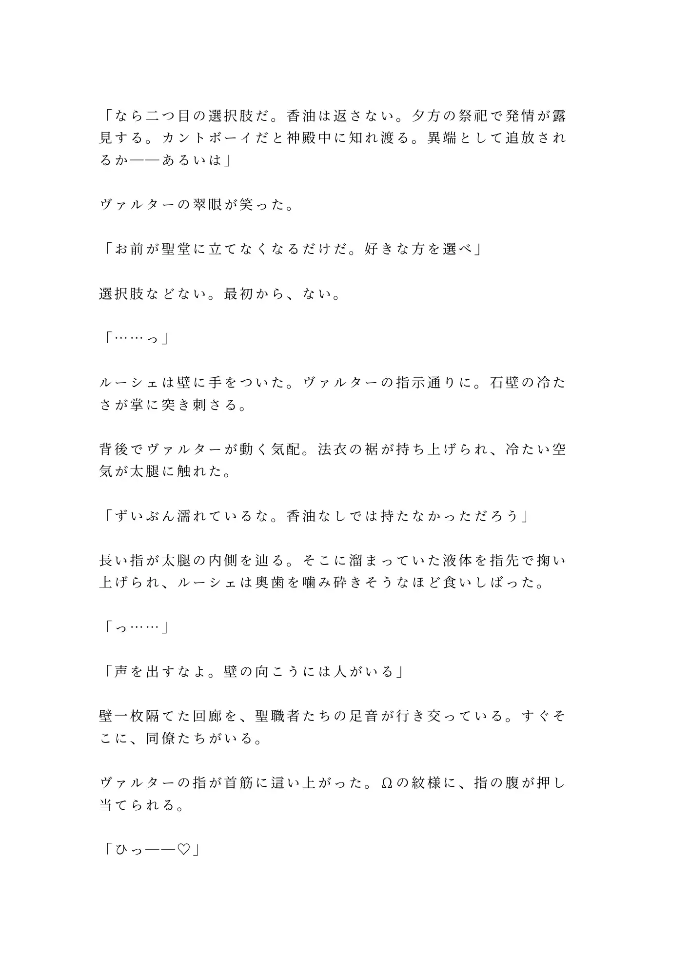 教典の一節を盾に、ヴァルターはルーシェの抑制香油を奪い取る。選択肢は二つ。聖堂の裏で大神官に身体を差し出すか、発情を全神殿に晒して異端として追放されるか。