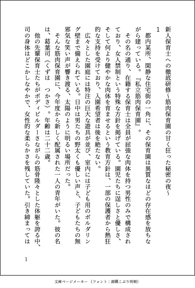 葛葉 司(くずは つかさ)/22歳 筋肉保育園に配属されたばかりの新人保育士。しなやかで線の細い体躯と、愛らしい中性的な顔立ちを持つ。 男性でありながら股間に「秘裂」と「子宮」を持つ特異媒体(カントボーイ)。その事実にコンプレックスを抱き、分厚い下着で必死に隠してきた。真面目で純粋な性格ゆえに、先輩たちの狂気的な愛撫と甘い洗脳に抗えず、快楽の底なし沼へと沈んでいく。