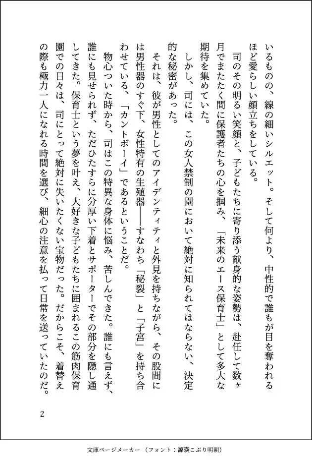 女人禁制、在籍する保育士は屈強な男たちのみという特殊な『私立筋肉保育園』。 新任保育士の葛葉司(22)は、子どもたちに慕われる未来のエースとして期待されていた。 しかし、彼には絶対に知られてはならない秘密があった。それは、男性でありながら女性の生殖器を持ち合わせる「カントボーイ」であること。ある金曜日の夜、居残りで作業をしていた司の背後に、憧れの先輩である瀬戸凪沙が現れる。 「君の股の間に隠している可愛い秘密の穴、僕たちがたっぷりと開発してあげる——」