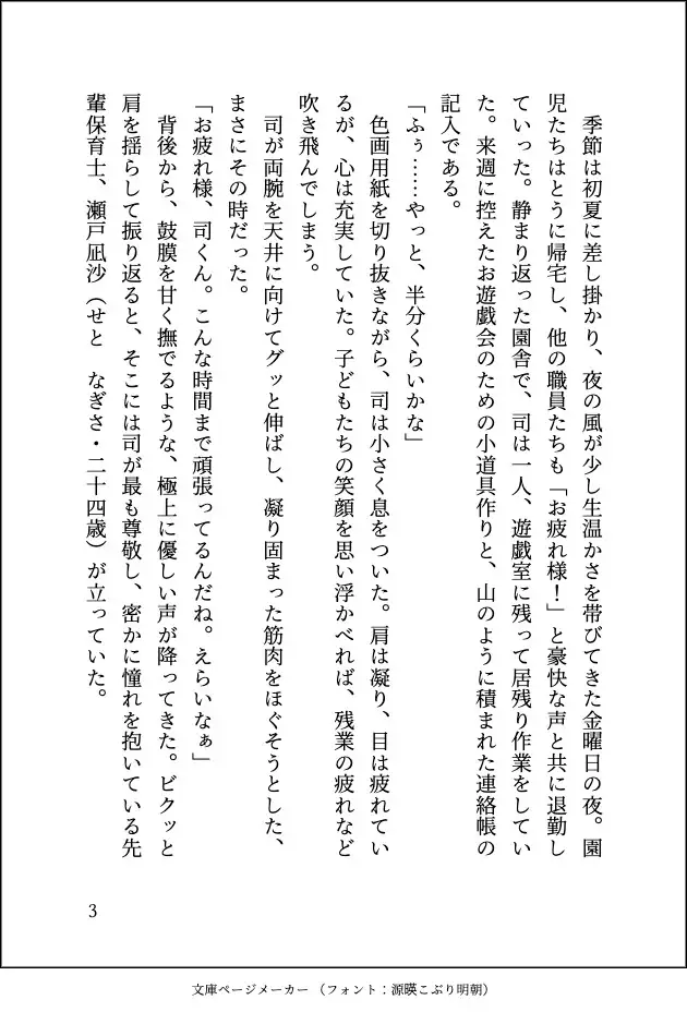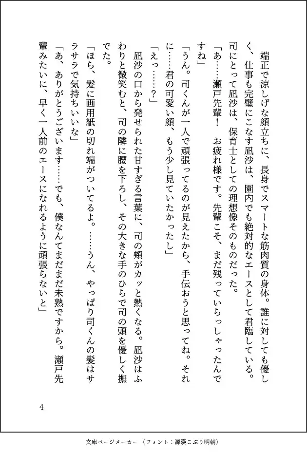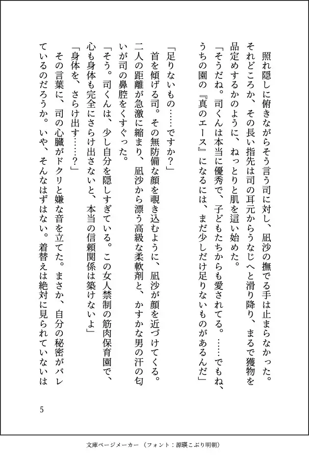 瀬戸 凪沙(せと なぎさ)/24歳 司が憧れる、筋肉保育園の絶対的エース保育士。スマートな筋肉質で、端正な顔立ち。 誰に対しても優しく完璧だが、その本性は底知れぬ支配欲と狂気を隠し持った「あまあまサイコパス」。極上に甘い言葉を囁きながら、緻密な指と舌のテクニックで司のデリケートな部分を執拗に責め立て、精神から完全に依存させる。