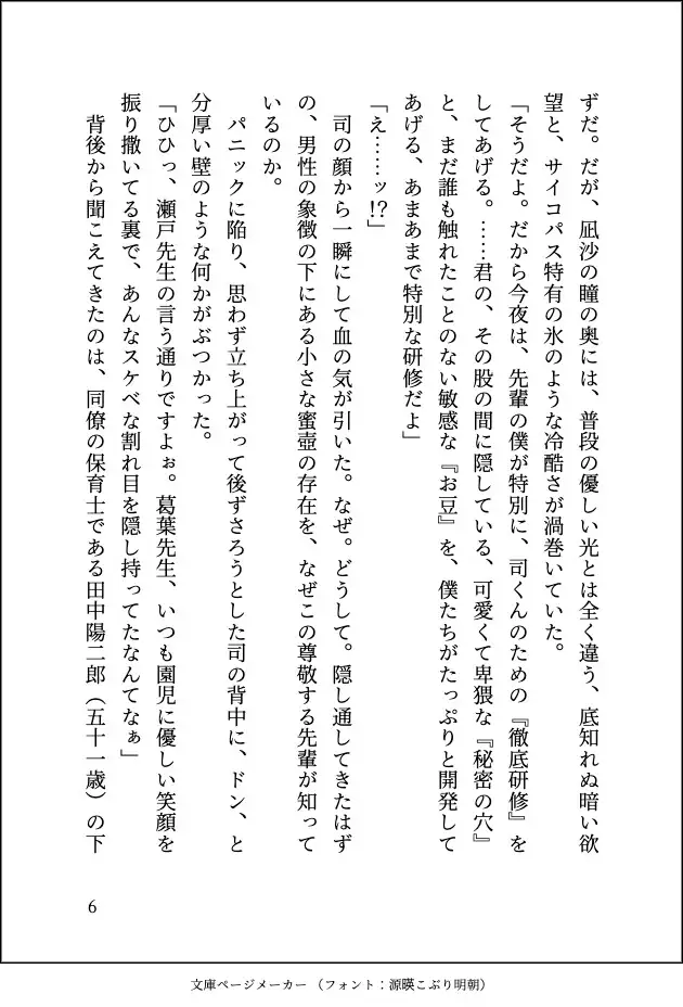 田中 陽二郎(たなか ようじろう)/51歳 司の同僚保育士。中肉中背で、常にいやらしい笑みを浮かべている。 物理的な拘束や、下品で卑猥な「言葉責め」、乳首などの痛みを伴う開発を担当。司の尊厳をズタズタに切り裂き、メスへと堕ちていく様を一番近くで嘲笑う。【シチュエーション・本作のアピールポイント】
