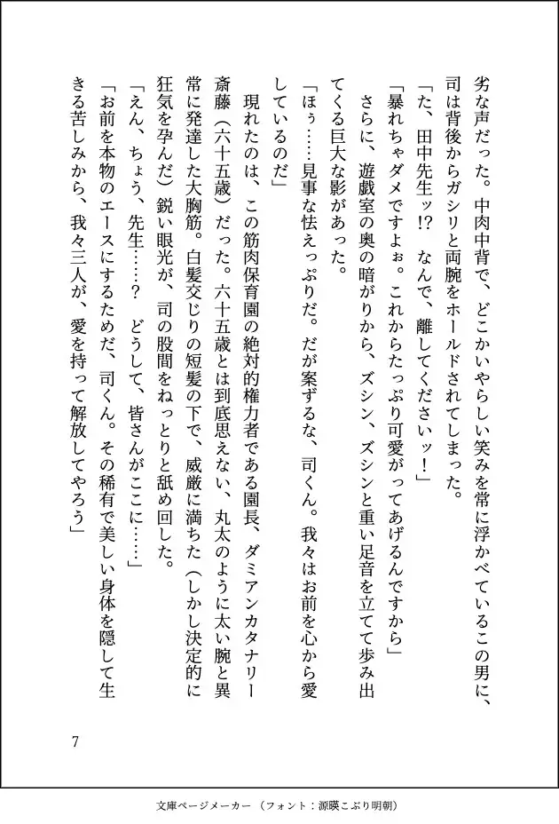 ダミアンカタナリー斎藤(だみあんかたなりー さいとう)/65歳 筋肉保育園の園長であり、絶対的権力者。65歳とは思えない丸太のような腕と異常な大胸筋を持つ巨漢。 威厳に満ちているが、性癖は決定的に狂っている。規格外の太さと硬さを誇る巨大な肉棒と、圧倒的な腕力で司の未開発な身体を物理的に破壊し、強引に悦びを叩き込む。
