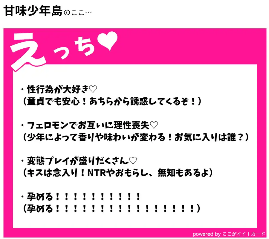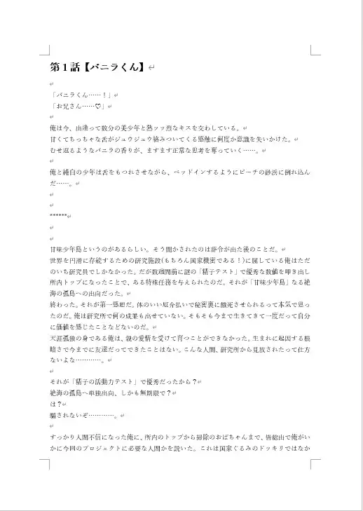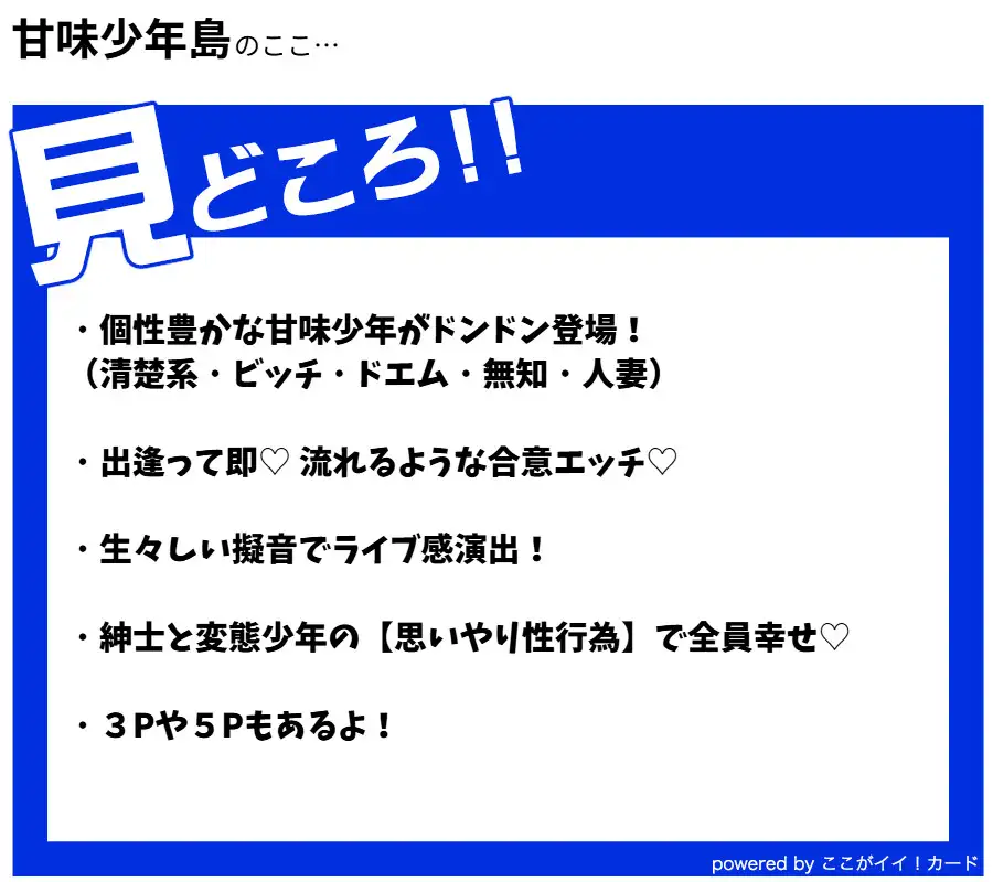 性交によって子を孕むことができる新人類と子づくりをするため、筋金入りの童貞である研究者のヨシタカは島へと出向する。味わい豊かな甘味少年たちとの出逢いはヨシタカの人生に何をもたらすのか。