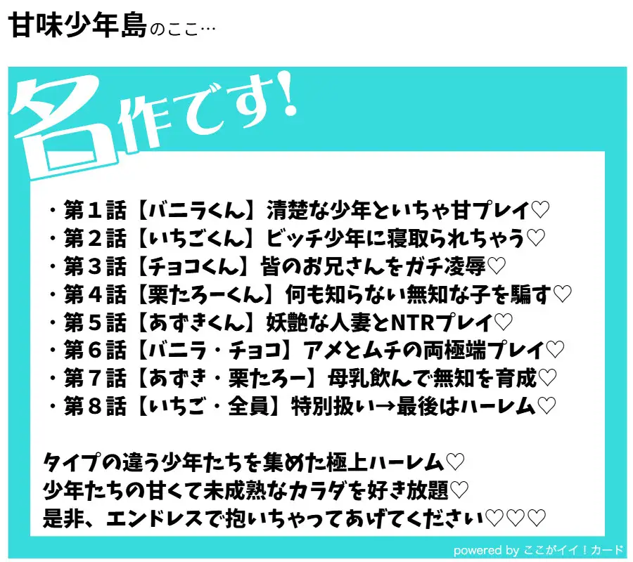 夢の美少年ハーレムでスケベ三昧できる生活を、あなたも味わってみませんか?本文:46858字(58P)全8話 読書推定時間100分超え