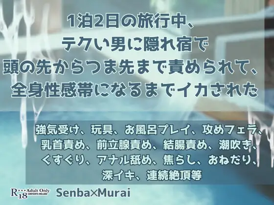 旅行当日待ち受けていたのは、車移動中からのセクハラに、宿についてからも二人きりの温泉で好き放題され、挙句の果てには温泉を出ても玩具プレイに発展。最後は丸一日かけて敏感にされた身体を、たっぷり芯まで犯されて――!?野外プレイに拘束くすぐり責め、玩具で連続絶頂からの潮吹きもとりいれつつ、全体的にはねっちりとした責め方で村井君が高められていく話に仕上げました。いつも通り相性が最悪で最高の二人の爽快なラブコメをお楽しみください。