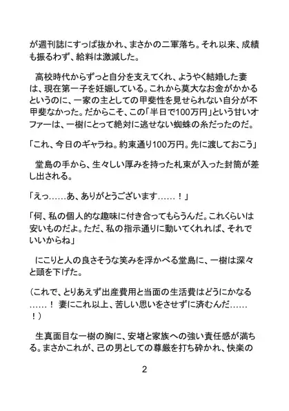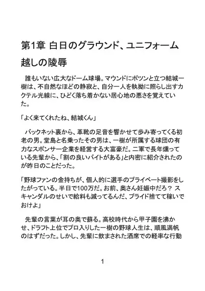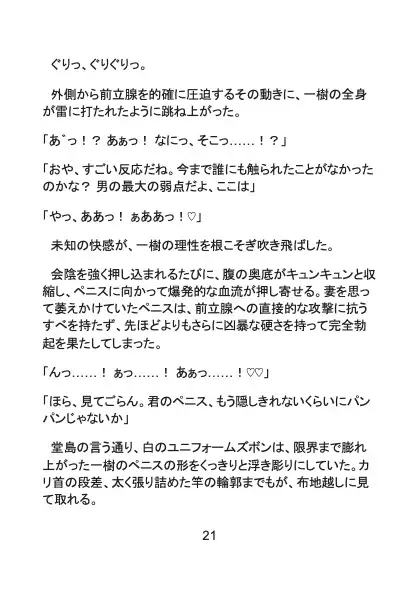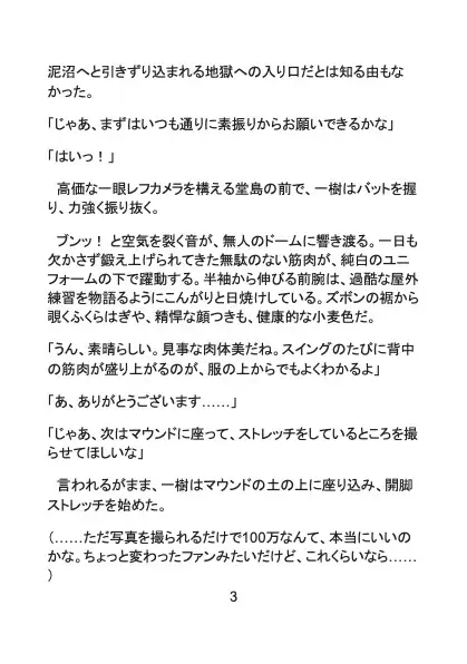 かつて甲子園を沸かせたスター選手でありながら、現在は二軍で燻り、妊娠中の妻を抱えて金策に苦しむプロ野球選手・結城一樹。そんな彼に舞い込んだのは、球団スポンサーである初老の大富豪・堂島からの「報酬100万円のプライベート撮影」という怪しい誘いだった。家族のため、プライドを捨てて誰もいない夜のドーム球場へ向かった一樹を待っていたのは、カメラの前での徹底的な陵○と屈辱の肉体開発だった。過酷な練習の証である日焼けした逞しい上半身と、ユニフォームに守られてきた白磁のような下半身。その艶めかしいコントラストをねっとりと暴かれ、抵抗する間もなく純潔の蕾をこじ開けられてしまう。堂島の熟練の指技と容赦ない寸止め○問により、妻帯者としての強い罪悪感は、次第に抗いがたい雄の快感へと塗り替えられていく。