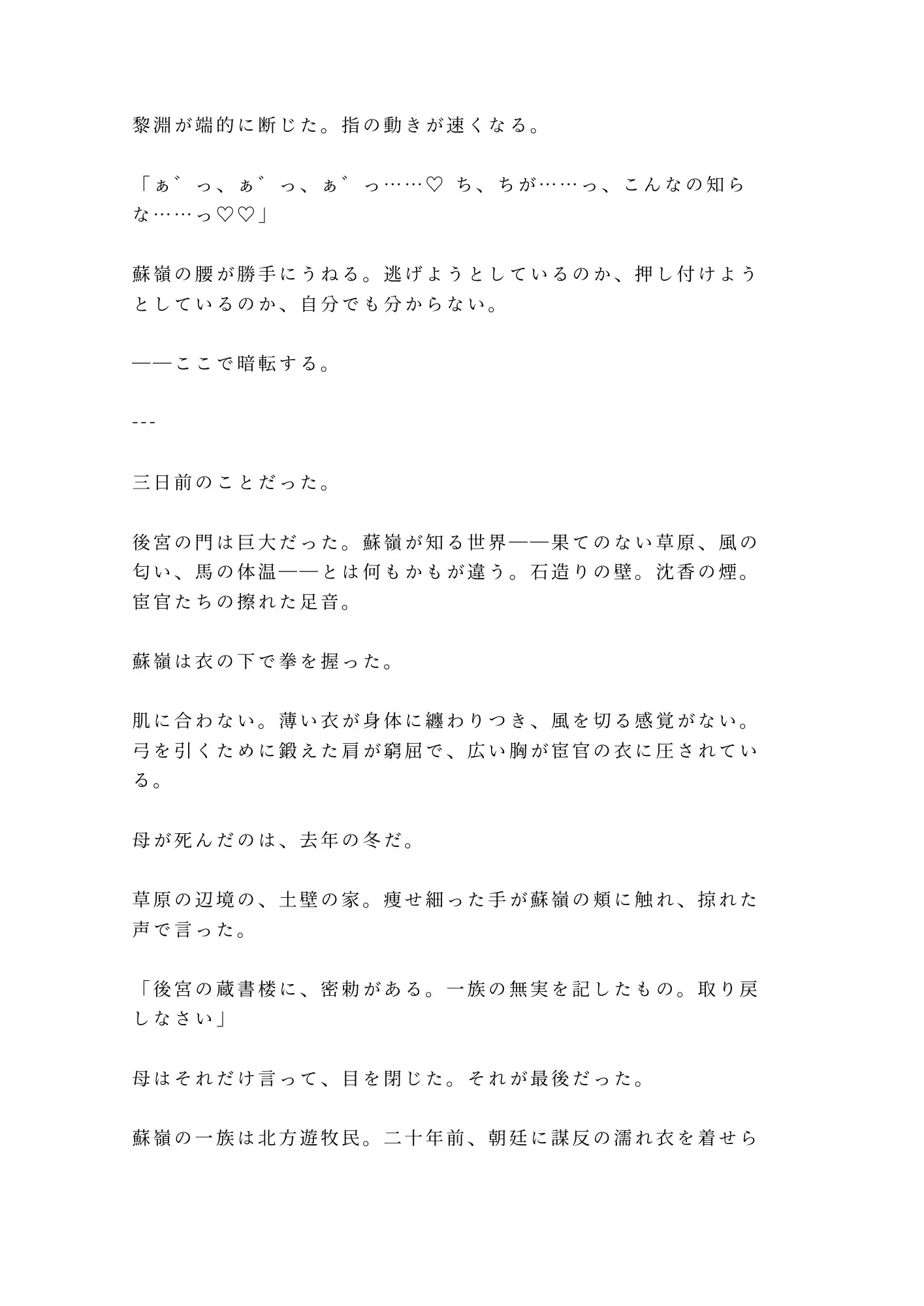 抗えば抗うほど身体は裏切り、声は甘く壊れていく。黎淵の冷徹な眼差しの奥に宿る執着。蘇嶺の折れない意志と、折られていく身体。支配と抵抗の果てに二人が辿り着く場所とは。