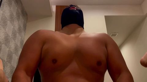 100キロガチムチ野郎がホテルで目隠しアナルプラグ装着して待機