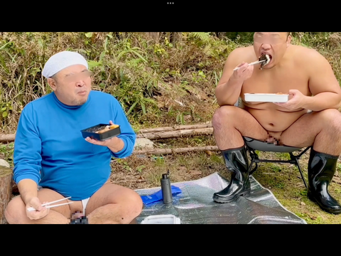 トコロテンで絶頂に達したマツモトのザーメンが弁当に落ちてしまう