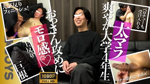 コメント:そろそろモデルが来る時間…しばらくすると、「ピンポーン!」チャイムが鳴り彼が入ってきます。「めっちゃ久々やん!」「お久しぶりです」顔は若干痩せて顎はシャープになり髪の毛も伸びてなんだか垢抜けた爽やか青年に…実を言うと彼が大学2年生の頃に2回ほど会っているんです。まさに2年ぶりの再会!とは言え彼はオマンコ大好きなノンケ**。カメラ回しっぱなしでさっそくiPadを渡しエロ動画鑑賞に…おじさんの話なんかそっちのけで動画を見入る彼…どうやらこの日のために1週間禁欲してきたそうです。そのせいかGパンの上から触ると…すでにカッチカチ!パンツにさせると真上に反り立つ太マラ!その後はスタッフのされるがまま濃厚キスにフェラ攻めには「あぁ…やばい…気持ちいい…」とモロ感状態!さらにケツ舐めラストは海老反りキスしながらの腰振りは圧巻のエロ!ラストは快感の限界で絶頂を迎えます!
