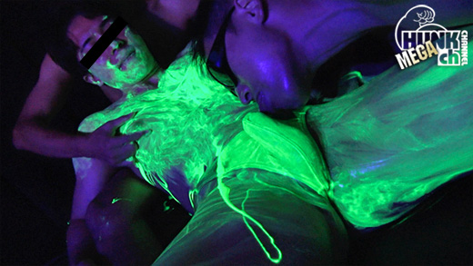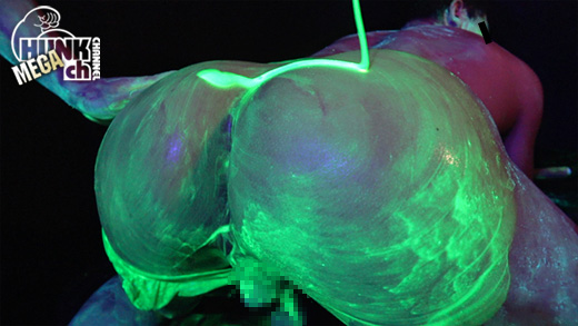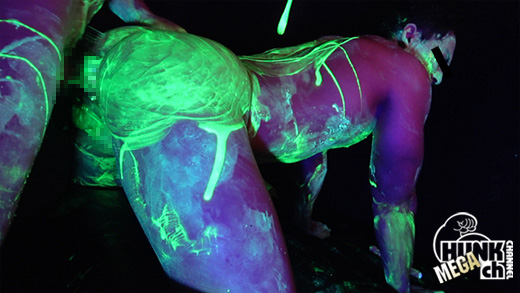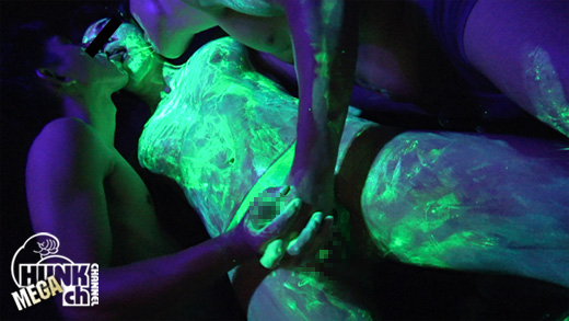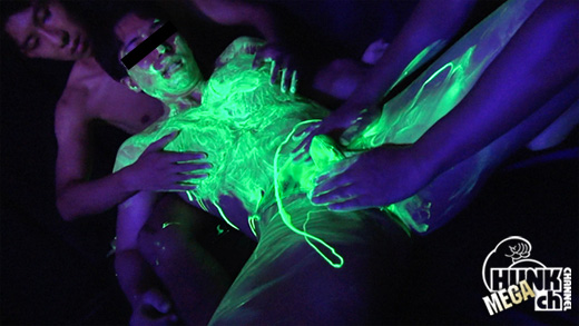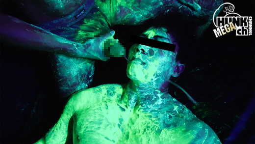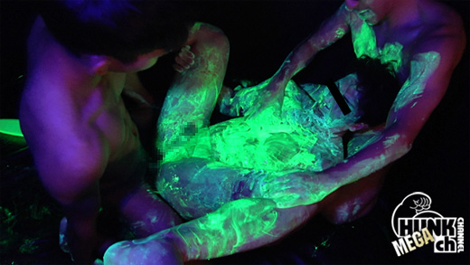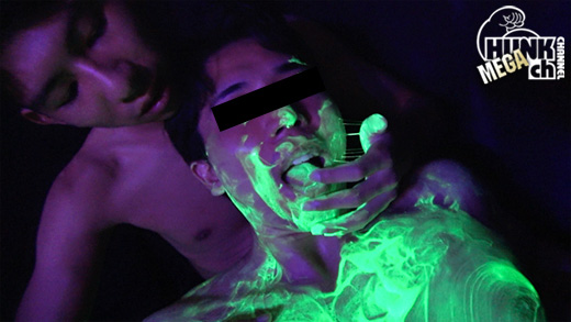 ブラックライトに薄く照らされた暗い部屋で、翔太郎は男二人に身体を弄られている。そこへ垂らされるのは、妖しく蛍光に発する潤滑液。顔や身体へ塗り広げられて汚される被虐的な快感を、翔太郎は味わう。すっかり蛍光にまみれた勃起マラはタチの口の中へ。両サイドから同時キスフェラで三位一体となっては情動的な刺激に耽り、這って男らのマラを尻に受け入れる。69で口を満たしながら、後ろからも突かれて喘ぎ声がくぐもる。男たちは翔太郎のケツを交互に愉しみ、絶頂マラから蛍光に汚れた顔面身体へザーメンが放たれる。(Colors GREEN ~Shotaro~)